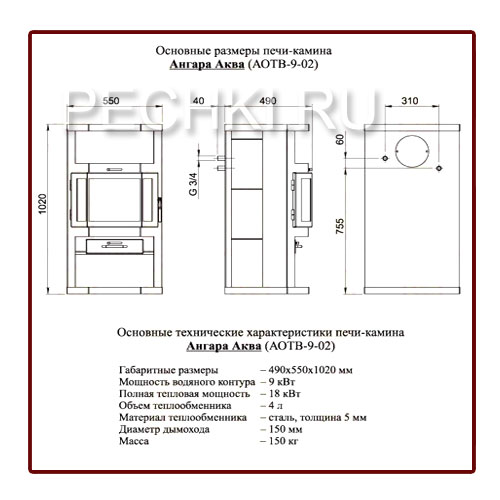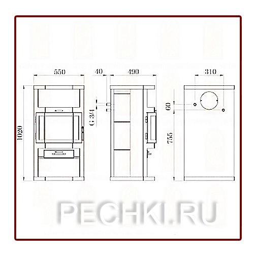 Диаметр дымохода - 150 мм Высота - 1010 мм Ширина - 560 мм Глубина - 510