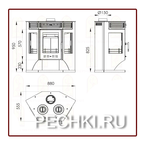 оборудован дверцей с жаропрочным стеклом «Neoceram N-O». Есть система «чистое стекло». Печь-камин оснащен двойным пламегасителем из нержавеющей стали, толщина дополнительного пламегасителя 5 мм. Для уплотнения разъемов используются современные уплотнительные материалы. Особенность данной модели — чугунный патрубок, чугунный колосник.