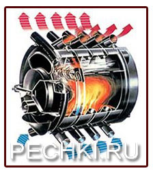 На заметку: Отопительная печь БРЕНЕРАН - гениальное техническое изобретение, экономящее деньги и энергию. Иначе, чем другие нагреватели, отдающие тепло только с внешней поверхности, печи БРЕНЕРАН с самого начала сконструирован как настоящий нагреватель воздуха. Цельнометаллическая конструкция с вваренными в нее многочисленными трубами обеспечивает принудительную конвекцию, благодаря чему происходит быстрое нагревание воздуха и его плавное распределение по всему объему помещения. Работает простой физический принцип - теплый воздух поднимается наверх, а более холодный постоянно всасывается с пола. Каждая из труб печи БРЕНЕРАН, полностью прикасаясь к топке, успевает нагреть проходящий через нее воздушный поток до 60 '- 150'C. Самая маленькая печь БРЕНЕРАН пропускает через себя 4,5 куб.м воздуха в минуту. В то же время температура самой печки остается достаточно низкой, она не раскаляется как "буржуйка". |
