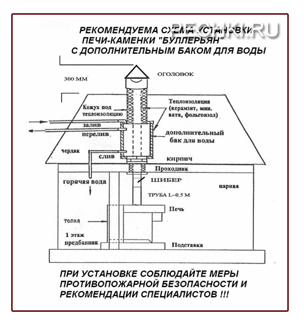 :: схема установки печи для бани БРЕНЕРАН с дополнительным баком для воды
