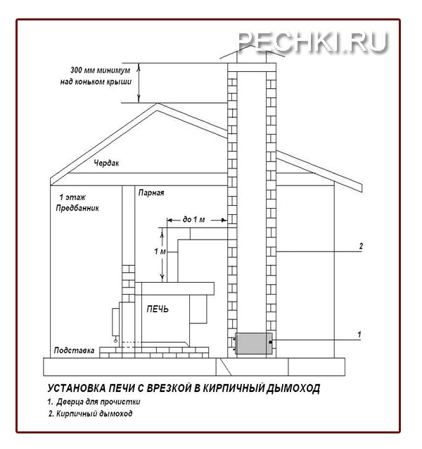 :: схема установки печи для бани БРЕНЕРАН с врезкой в кирпичный дымоход