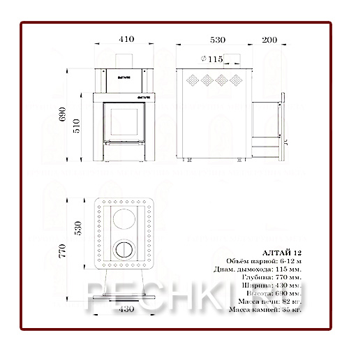 АЛТАЙ 12 (12 куб.м) самая маленькая и компактная, отсюда и название, подойдет для небольшой парной площадью парной до 5 м.кв (при высоте потолков не выше 2,5 - 2,7 м). Толщина металла топочной камеры 5—8 мм. Кожух-конвектор создает мощный горячий конвекционный поток, равномерно прогревающий парилку, и экранирует жесткое инфракрасное излучение, исходящее от раскаленных стенок топки. Вентилируемая вместительная каменка прогревается пламенем с нескольких сторон и эффективно нагревает камни.Дожиг вторичных газов обеспечивает высокую эффективность и большую полноту сгорания топлива.