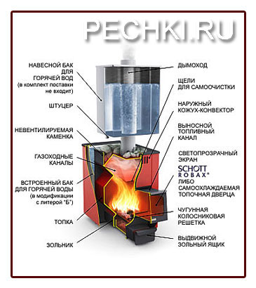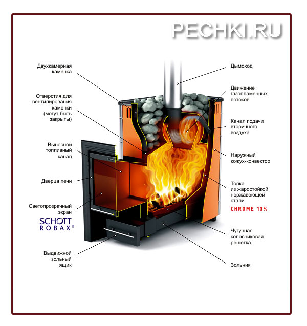 Кожух-конвектор ускоряет нагрев воздуха в парилке за счет образуемого им мощного конвекционного потока. Кроме того, он экранирует жесткое инфракрасное излучение, исходящее от стенок топки, что создает мягкое тепло в парилке и служит защитой от случайного прикосновения к печи во время ее работы.