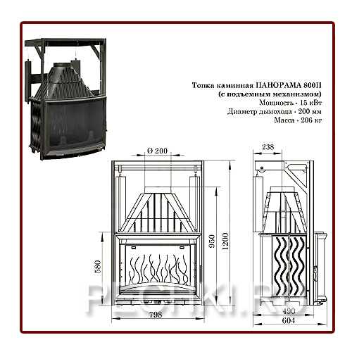 Технические характеристики: Мощность: 15 кВт Ширина: 798 мм Высота общая: 1200 мм Высота по фасаду: 580 мм Глубина: 604 мм Масса: 206 кг Диаметр дымохода: 200 мм Поднимающий дверцу механизм: есть Тип: закрытая чугунная каминная топка Производитель: Мета Ardennes, Франция-Россия