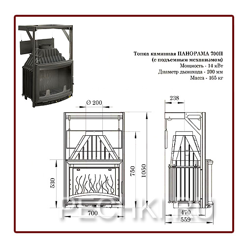 Аналог каминной топки ПАНОРАМА 700. Для удобства пользования дверца топочной камеры оснащена подъёмным (П) механизмом открывания.
