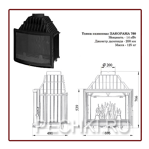 Технические характеристики: Мощность: 14 кВт Ширина: 696 мм Высота общая: 766 мм Высота по фасаду: 539 мм Глубина: 491 мм Масса: 125 кг Диаметр дымохода: 200 мм Поднимающий дверцу механизм: нет Тип: закрытая чугунная каминная топка Производитель: Мета Ardennes, Франция-Россия